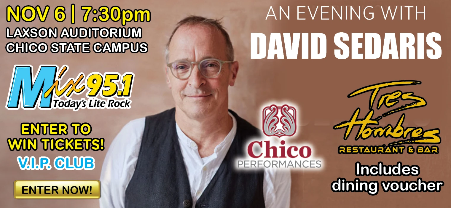 Play our sweepstake for a chance to win a pair of tickets to see David Sedaris. Includes a dining voucher from Tres Hombres in Chico.