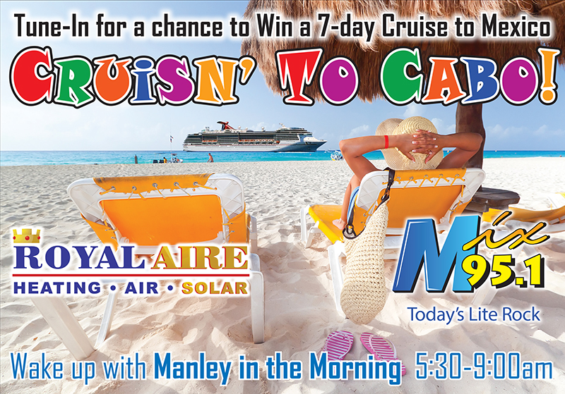 CRUISIN' TO CABO CONTEST ends June 12, 2015. Listen for your cue to call.Sponsored: Royal Aire Heating & Air ConditioningWatch for our TV commercials on the following stations: KHSL TV12 | KNVN TV24 | Action News Now | CW10. Production: Engelbrecht Advertising