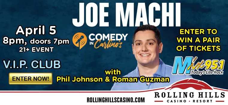 Play our sweepstake for a chance to win tickets to the Joe Machi Comedy Show, happening at Rolling Hills Casino (2655 Everett Freeman Way, Corning) on Apr 5th @8PM! Doors open at 7PM!