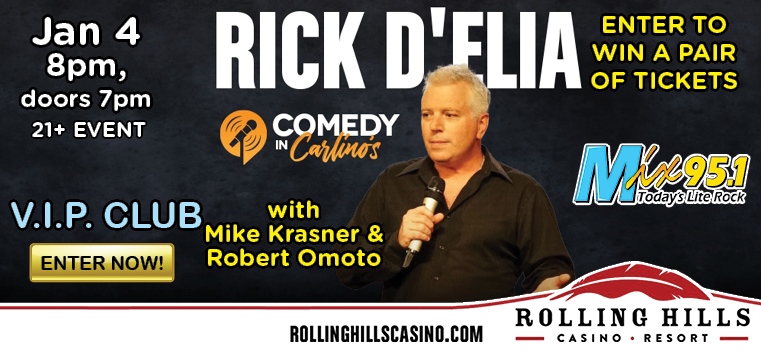 Play our sweepstake for a chance to win tickets to the Rick D'Elia Comedy Show, happening at Rolling Hills Casino (2655 Everett Freeman Way, Corning) on January 4th @8PM!